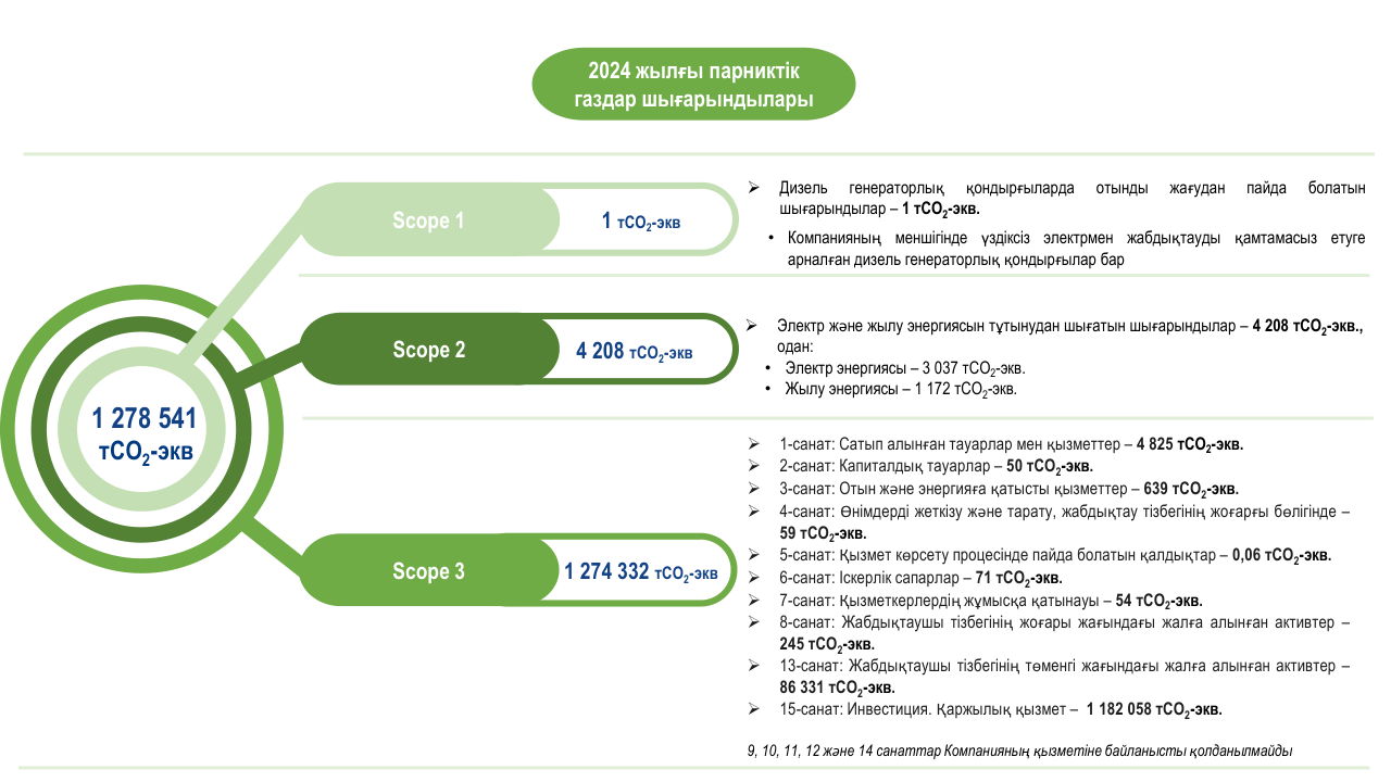 • Scope 1 – Компанияның бақылауындағы көздерден шығатын тікелей парниктік газдар шығарындылары;