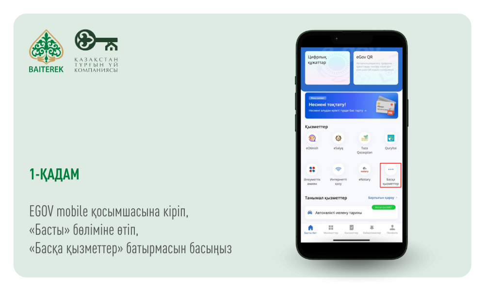1-қадам. EGOV mobile қосымшасына кіріп, «Басты» бөліміне өтіп, «Басқа қызметтер» батырмасын басыңыз.