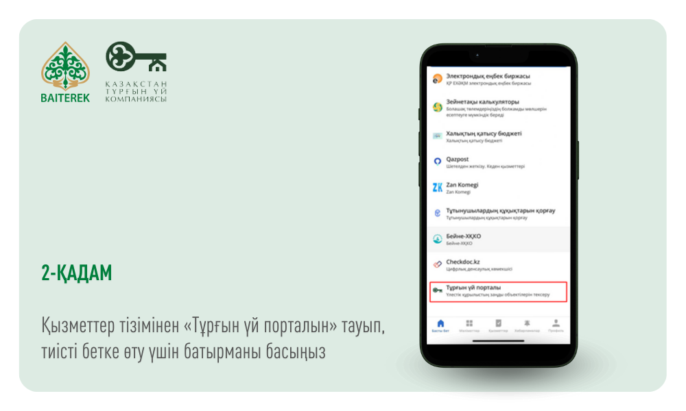 2-қадам. Қызметтер тізімінен «Тұрғын үй порталын» тауып, тиісті бетке өту үшін батырманы басыңыз.