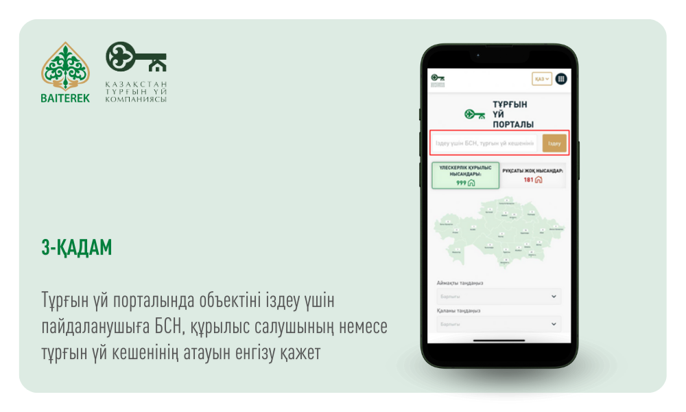 3-қадам. Тұрғын үй порталында объектіні іздеу үшін пайдаланушыға БСН, құрылыс салушының немесе тұрғын үй кешенінің атауын енгізу қажет.