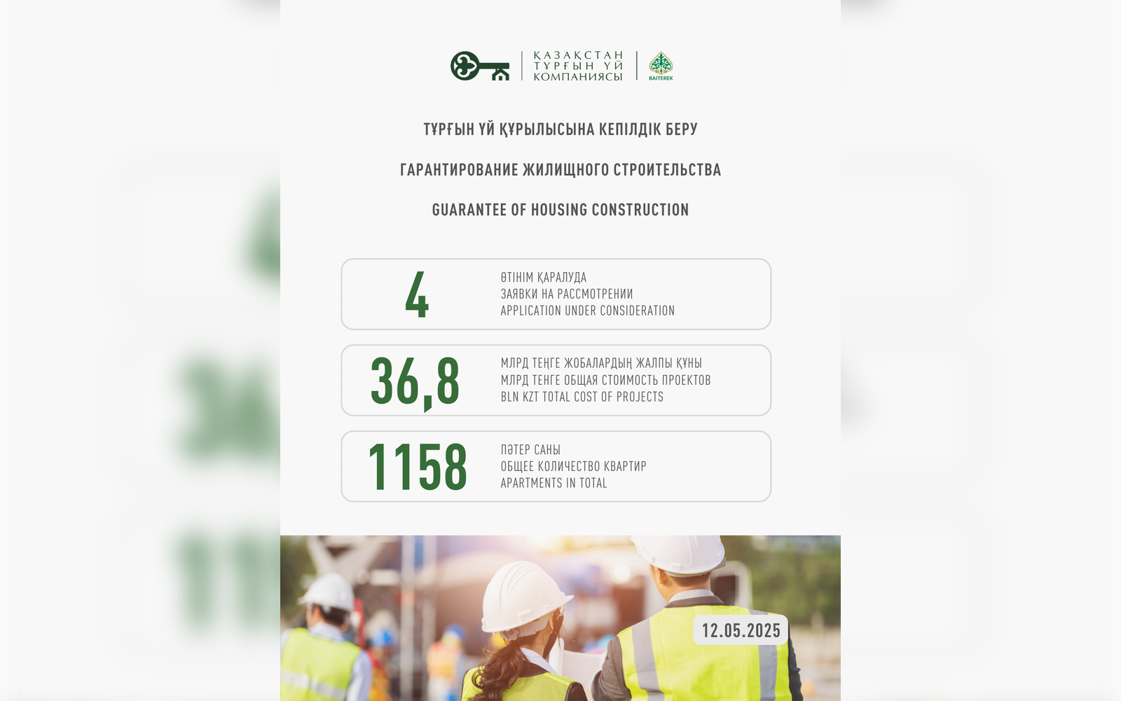 1) АО «Казахстанская Жилищная Компания» сообщает, что в целях обеспечения обязательств уполномоченной компании по строительству многоквартирного жилого дома, приемки его в эксплуатацию и передаче долей дольщикам, с 1 января 2025 года в рамках подачи заявок на получение гарантии на завершение строительства в состав проектно-сметной документации по проекту в обязательном порядке должны входить решения по строительству инженерных сетей, в том числе наружных систем и оборудований, благоустройства и озеленения в пределах территорий, отведенных под строительство многоквартирного жилого дома.