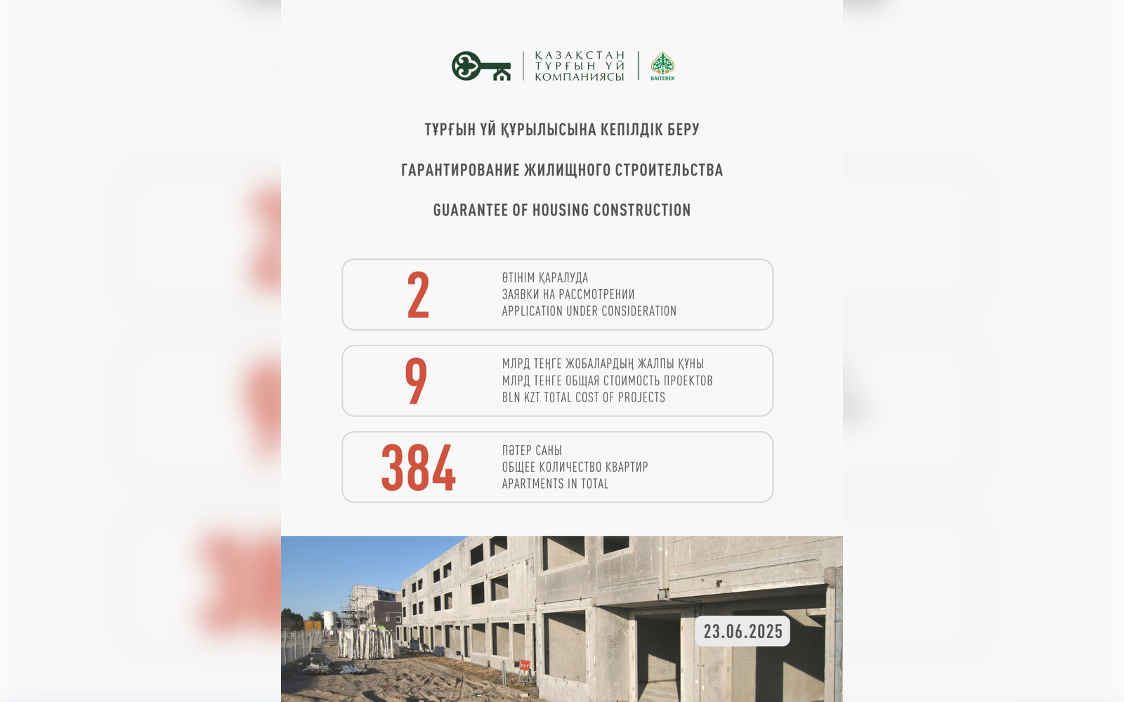 На рассмотрении Единого оператора жилищного строительства находятся 2 заявки по проектам общей стоимостью порядка 9 млрд тенге, общим количеством – 384 квартиры. Информация по действующим гарантиям размещена на интернет-ресурсе www.khc.kz в соответствии с требованиями Закона РК «О долевом участии в жилищном строительстве». Информация по объектам долевого участия, получившим гарантию и разрешение на привлечение средств дольщиков, предоставлена на homeportal.kz.