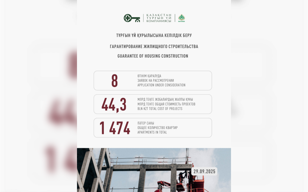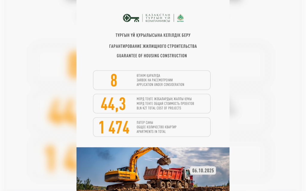 На рассмотрении Единого оператора жилищного строительства находятся 8 заявок по проектам общей стоимостью порядка 44,3 млрд тенге, общим количеством – 1 474 квартиры. Информация по действующим гарантиям размещена на интернет-ресурсе www.khc.kz в соответствии с требованиями Закона РК «О долевом участии в жилищном строительстве». Информация по объектам долевого участия, получившим гарантию и разрешение на привлечение средств дольщиков, …